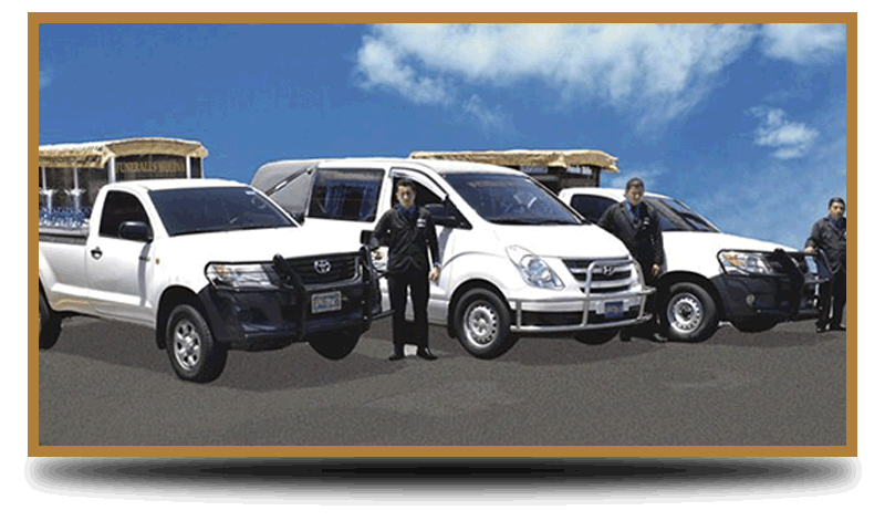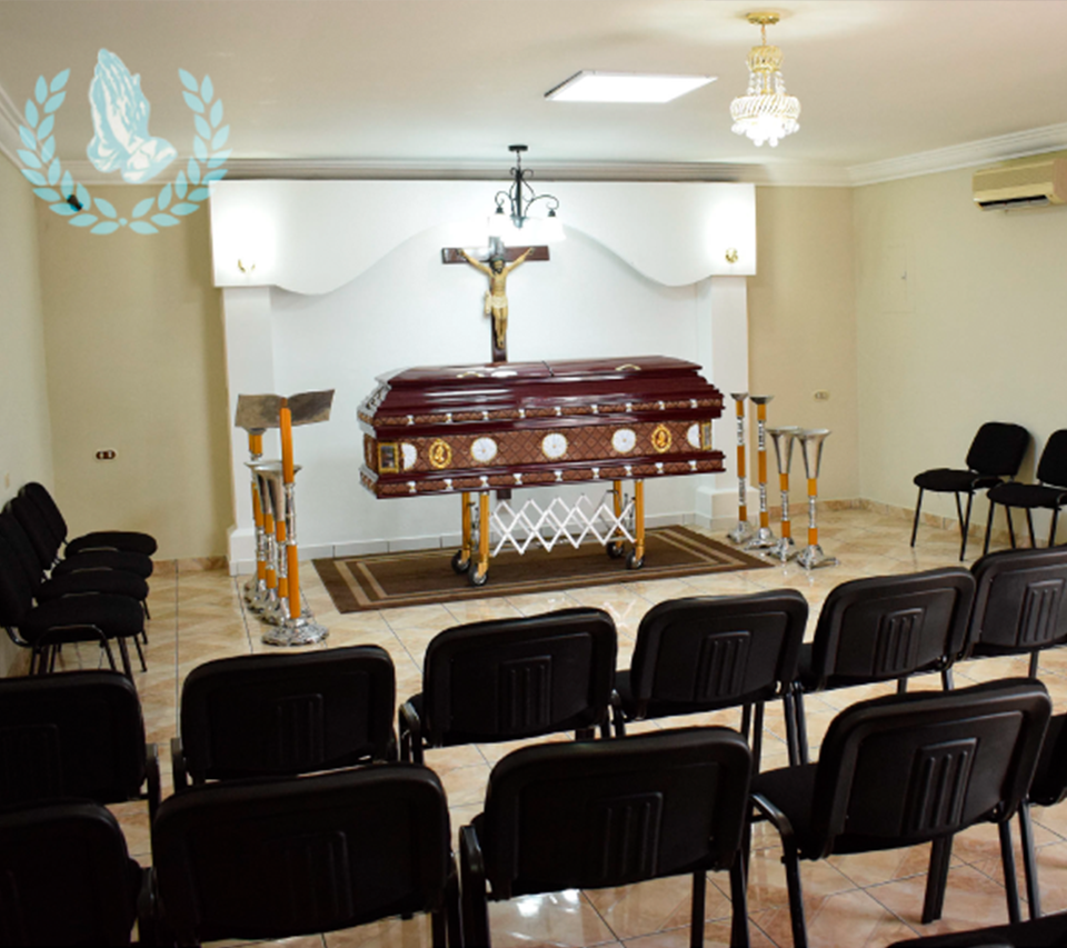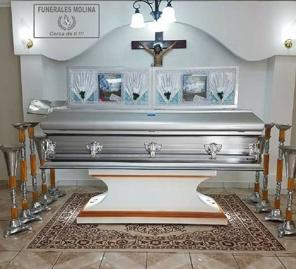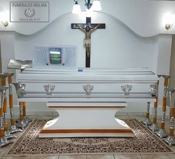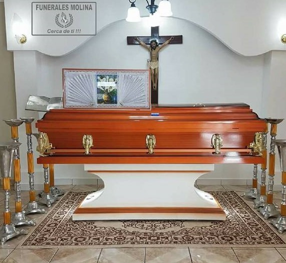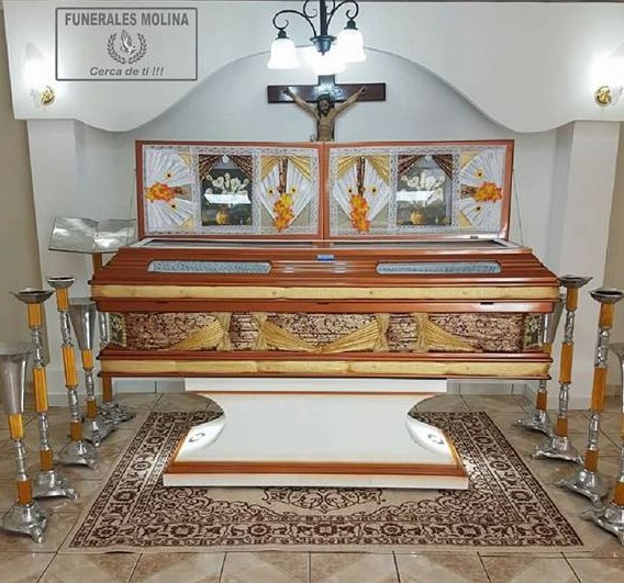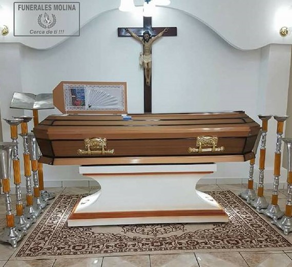 Ataúd en madera, forrado por dentro, pintado a duco con adornos, instalacion de capilla con crucifijo, 25 sillas, 4 candeleros, carro funebre con su carretilla